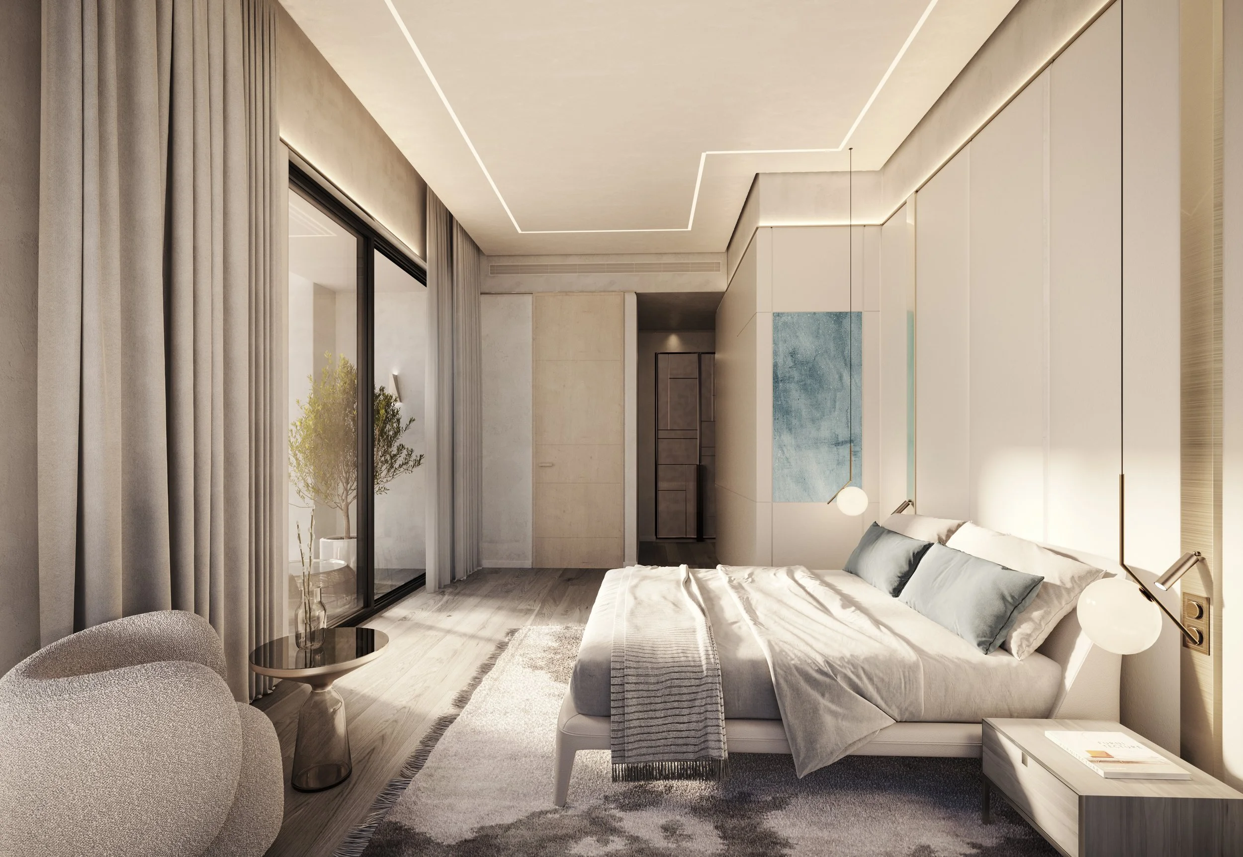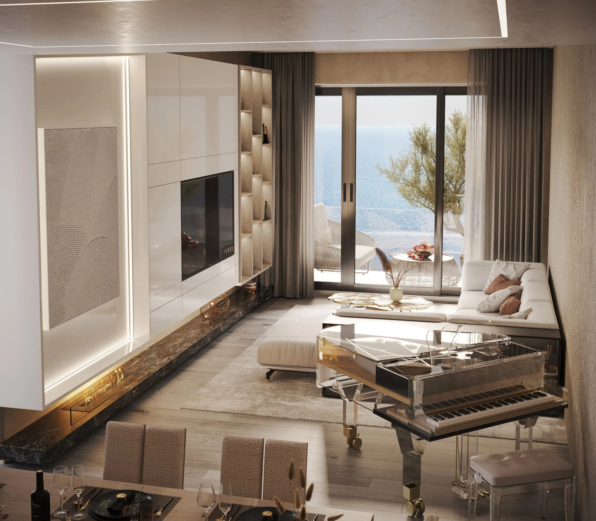 Nestled in The Address Hotel Residences at Jumeirah Beach, this bespoke luxury apartment epitomizes timeless elegance and sophistication. Designed with a discerning client in mind, the residence features a palette of neutral tones complemented by earthy accents, creating a serene ambiance reminiscent of a tranquil seaside escape. The seamless integration of these hues facilitates a gentle transition from the indoors to the breathtaking beach views visible from the expansive balcony.